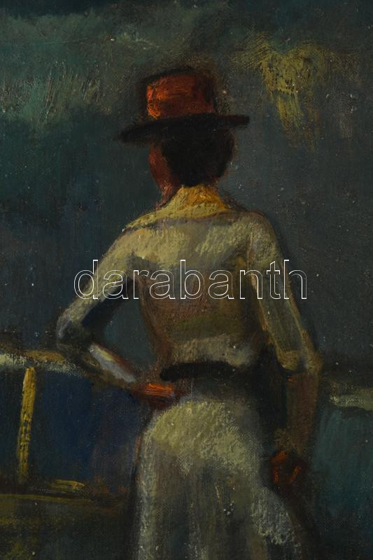 Leírás: Olvashatatlan (Tibor Ernő?) jelzéssel, balra lent: Napernyős hölgy vízparton. Olaj, vászon. Dublírozott. 4x34,5 cm