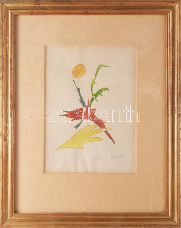 Leírás: Barta István (1892-1976): Absztrakt táj, 1947. Vegyes technika, papír, jelzett, üvegezett fakeretben. Néhány kevés apró folttal. 27,5x19,5 cm