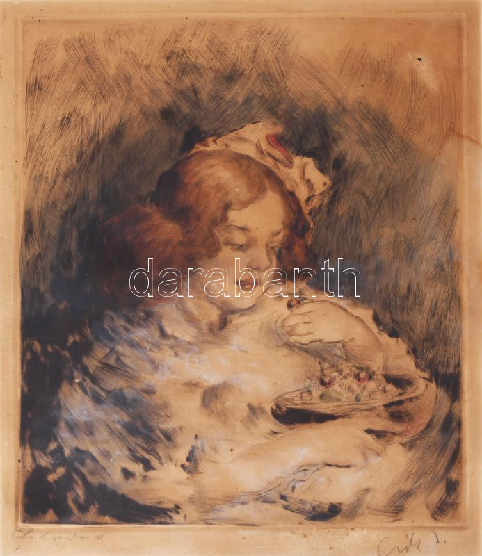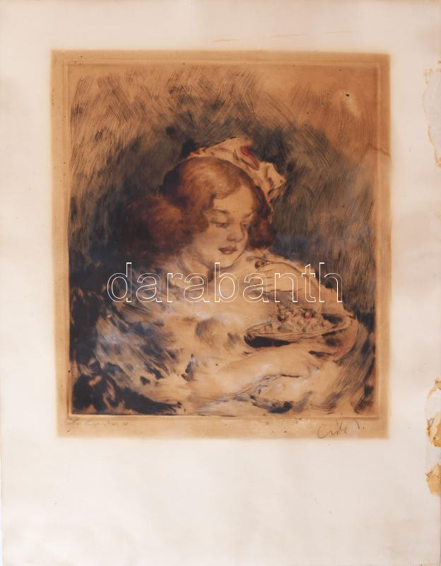 Leírás: Csók István (1865-1961) - Prihoda István (1891-1956): Züzü. Színezett rézkarc, papír, jelzett (Csók I és Prihoda által). Kissé foltos. Lap szélén kisebb felületi sérülésekkel. 26x23 cm