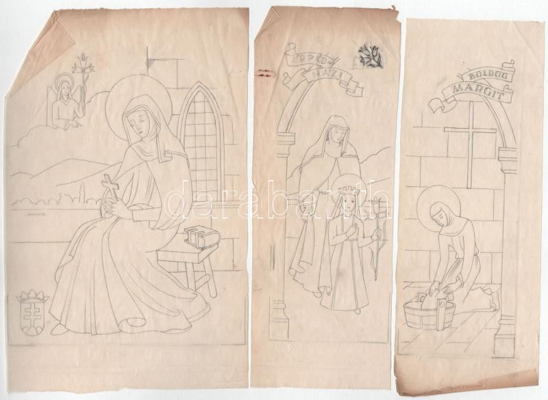 Leírás: Dabis Blanka, Ferenczy Jenőné (1909-1980), 4 db mű: Szárnyasoltár terve, Szent Margit alakjával, 1937. Ceruza, papír vagy hártyapapír, jelzett. 24x35 (papír) és 25x9 és 25x16 cm közötti méretekben.
