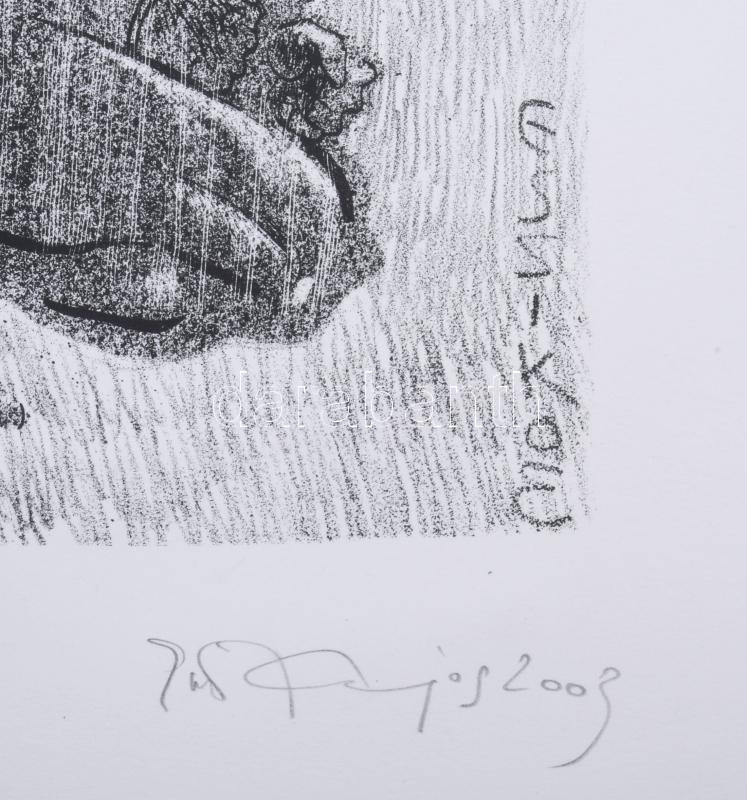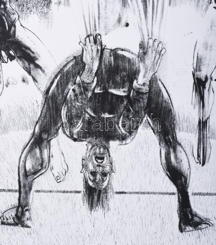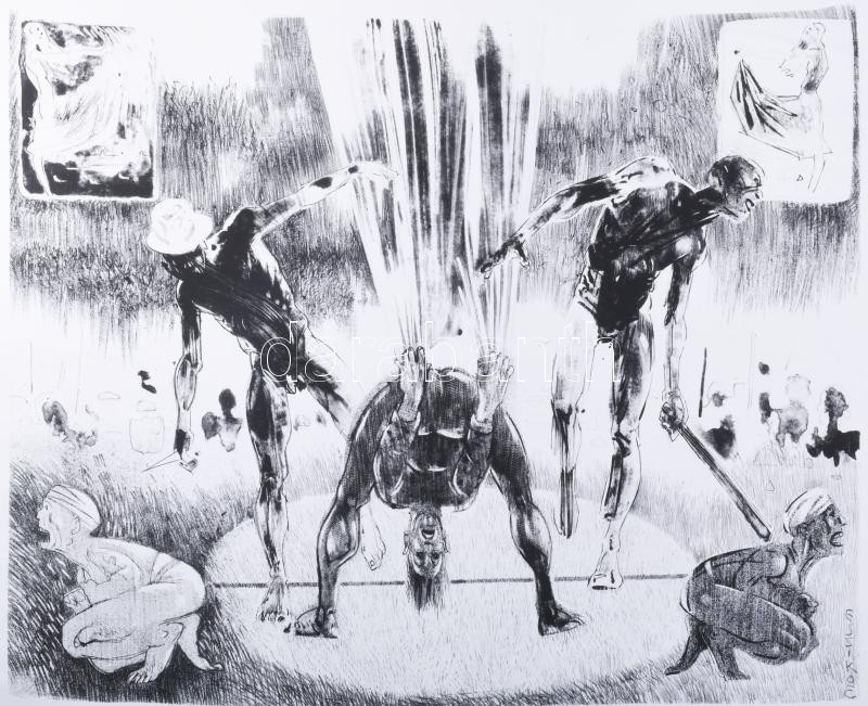 Leírás: Eszik Alajos (1953-): Megelőző csapás. Litográfia, papír. Jelzett. Művészpéldány EA jelzéssel. 50×66 cm.
