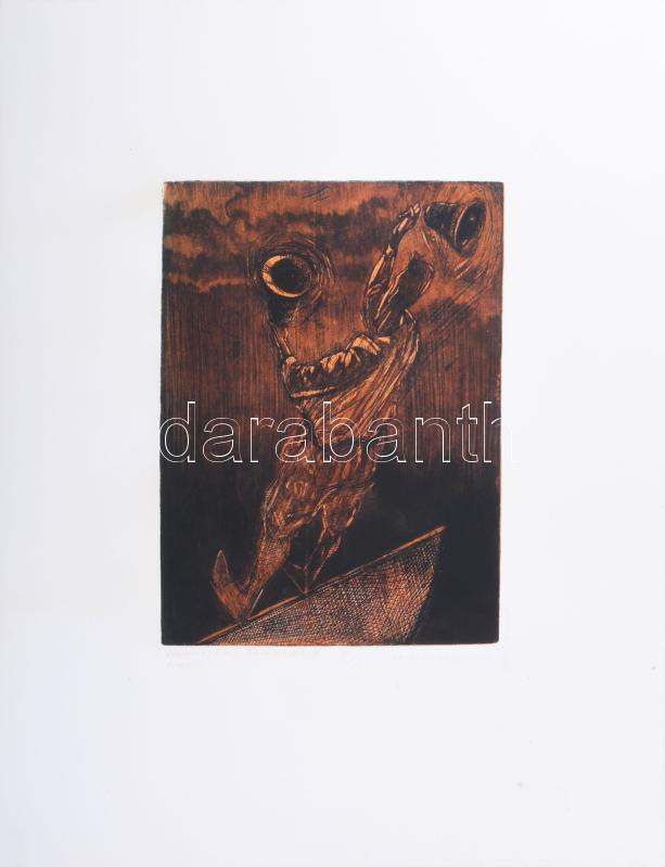 Leírás: Eszik Alajos (1953-): Vadromantikus bagatellek III., 2000. Rézkarc, aquatinta, papír. Jelzett. Számozott (II/XV). Hátoldalán a művész bélyegzőjével és kisebb felületi sérüléssel. 32×23 cm.