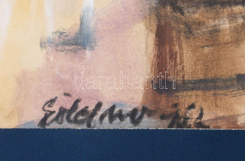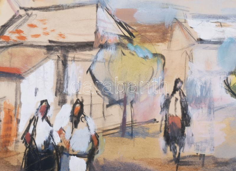 Leírás: Göldner Tibor (1929-2013): Vízparti falu, 1962. Vegyes technika, papír. Jelzett. Hátoldalán Képcsarnok Vállalat címkéjével. Paszpartuban. 35,5x46,5 cm