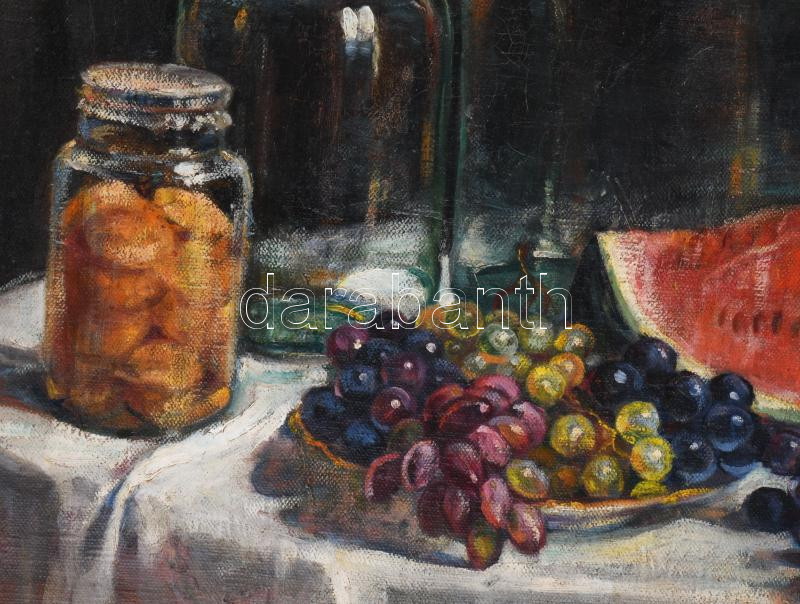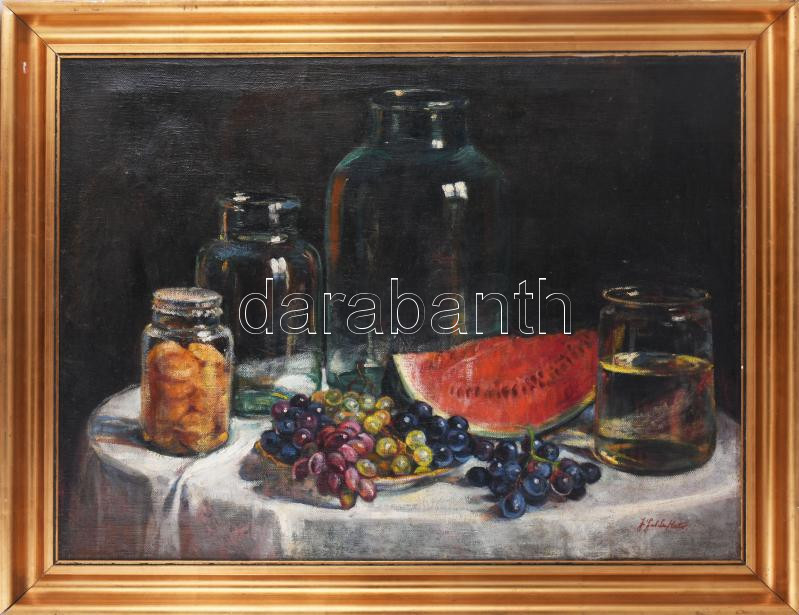 Leírás: J. Fehér Kató (1897-): Dinnyés csendélet. Olaj, vászon, jelzett. Proveniencia: Saphier-gyűjtemény. Dekoratív, kissé sérült fakeretben. 60x80 cm