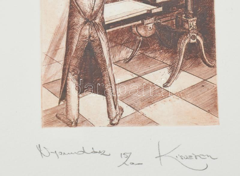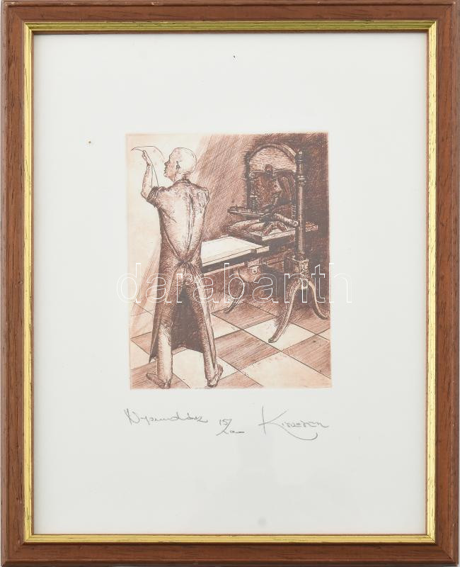 Leírás: Kiss Péter (1957-): Nyomdász. Színes rézkarc, papír, jelzett. Számozott: 15/100. Üvegezett fakeretben. 11,5x9,5 cm