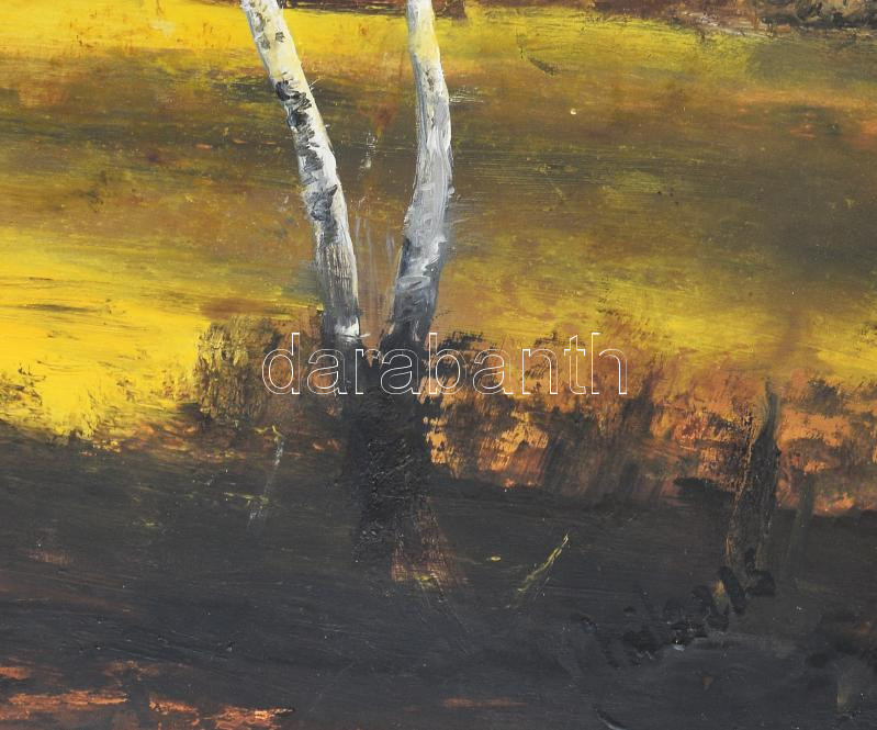 Leírás: Mikus Ferenc (1938-): Alföldi táj. Olaj, karton, jelezve jobbra lent. Fakeretben. 55x80 cm.