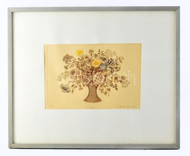 Leírás: Molnár Gabriella (1940-): Kosár. Színezett rézkarc, papír, jelzett, 22x32 cm Üvegezett keretben