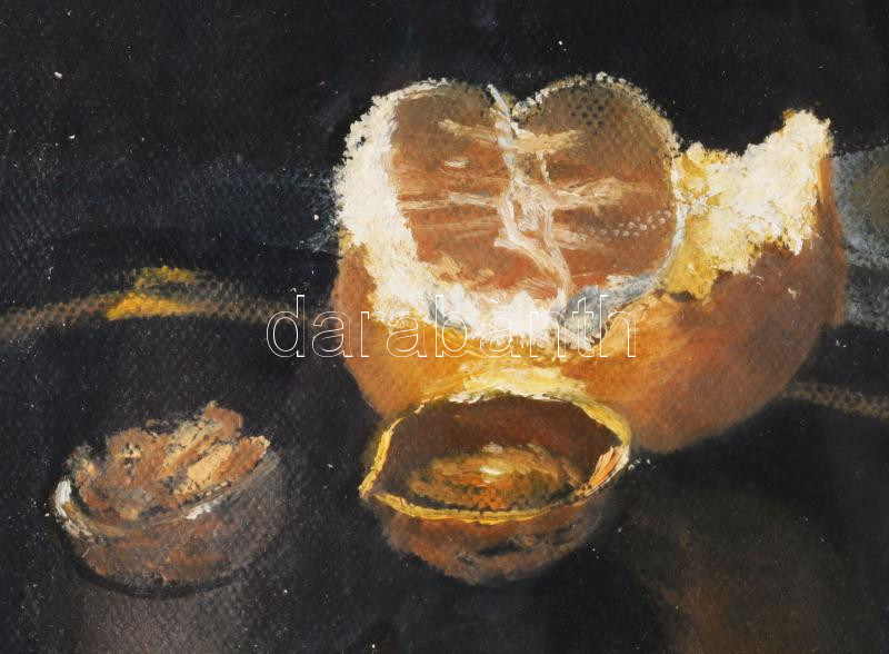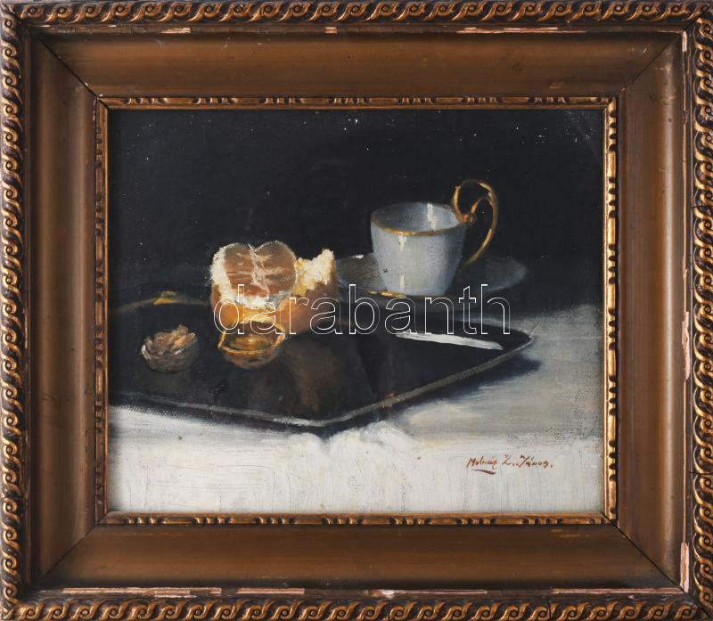 Leírás: Molnár Z. János (1880-1960): Asztali csendélet porcelánnal és gyümölcsökkel. Olaj, vászon, jelezve jobbra lent. Dekoratív, üvegezett, kissé sérült fakeretben, 26x31 cm
