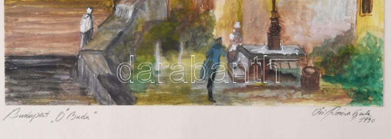 Leírás: Őri Rózsa Gyula (?- ): Budapest, "O" Buda, 1990. Akvarell, papír, jelzett. Dekoratív, üvegezett fakeretben, 30×21,5 cm