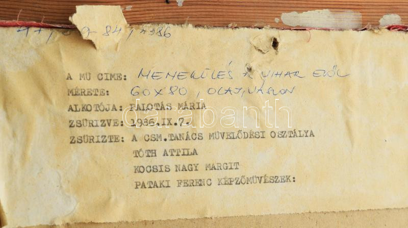 Leírás: Palotás Mária (-): Mernekülés a vihar elől. Olaj, vászon. Jelezve balra lent. Hátoldalán zsűri címkével 1986-ból. Fakeretben. 80x60 cm.