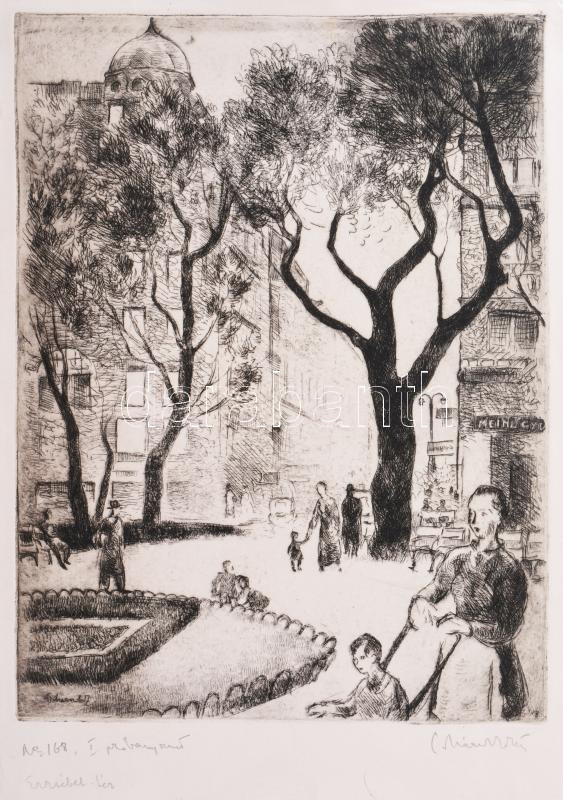 Leírás: Pohárnok Zoltán (1905-1976): Erzsébet tér, Budapest. Rézkarc, papír, jelzett, I. próbanyomat, 29,5x21,5 cm