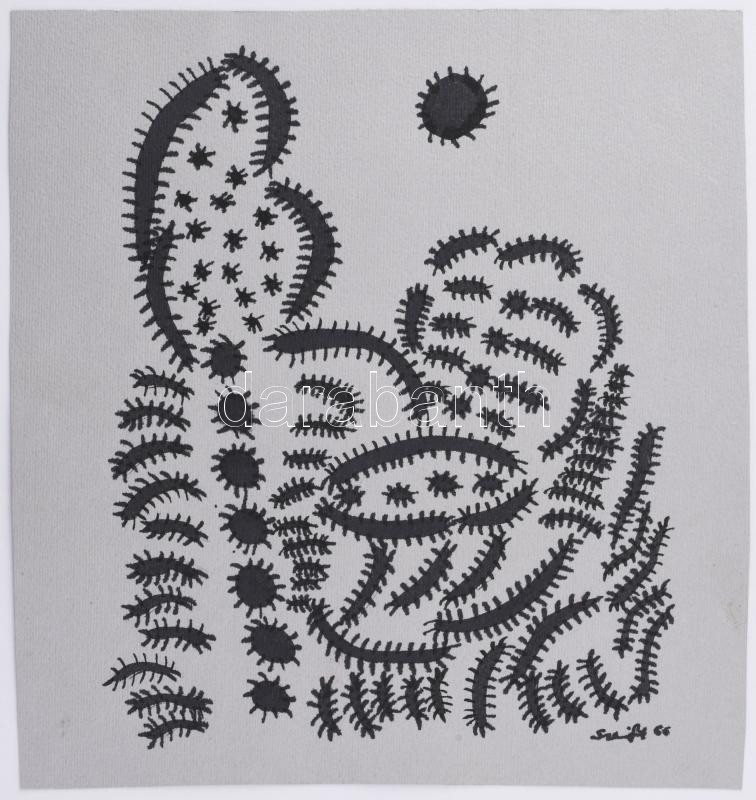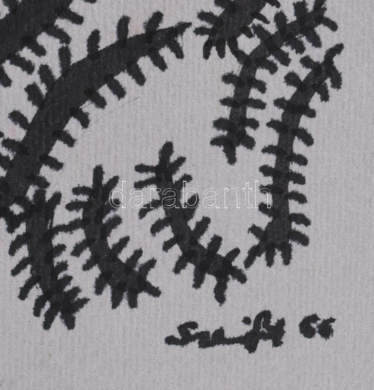 Leírás: Szeift Béla (1944-2012): Kompozíció, 1966. Tus, papír, jelzett, lap teteje papírra kasírozva, 23x20,5 cm