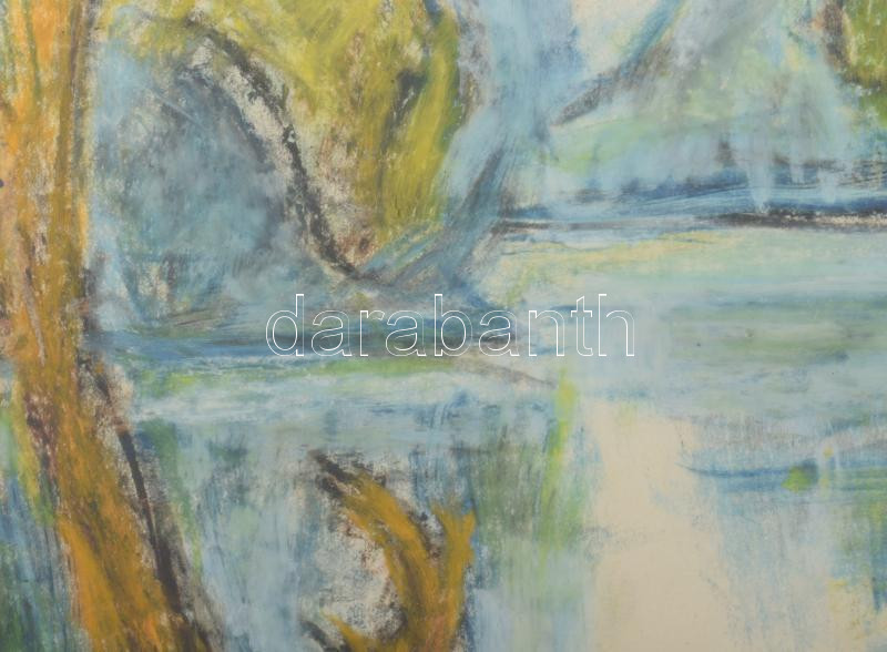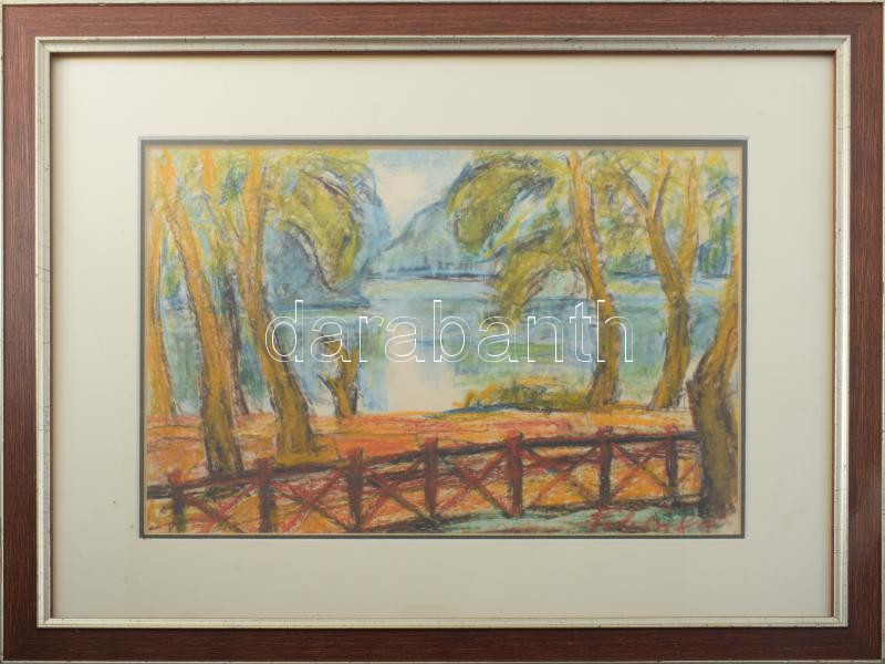 Leírás: Tábori József (1928-2001): Tatai tó. Kréta, papír. Jelzett. Üvegezett fakeretben, 21x32 cm
