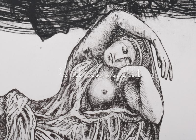 Leírás: Vén Zoltán (1941-): Ariadné álma. Litográfia, papír, jelzett, próbanyomat , 64x49 cm
