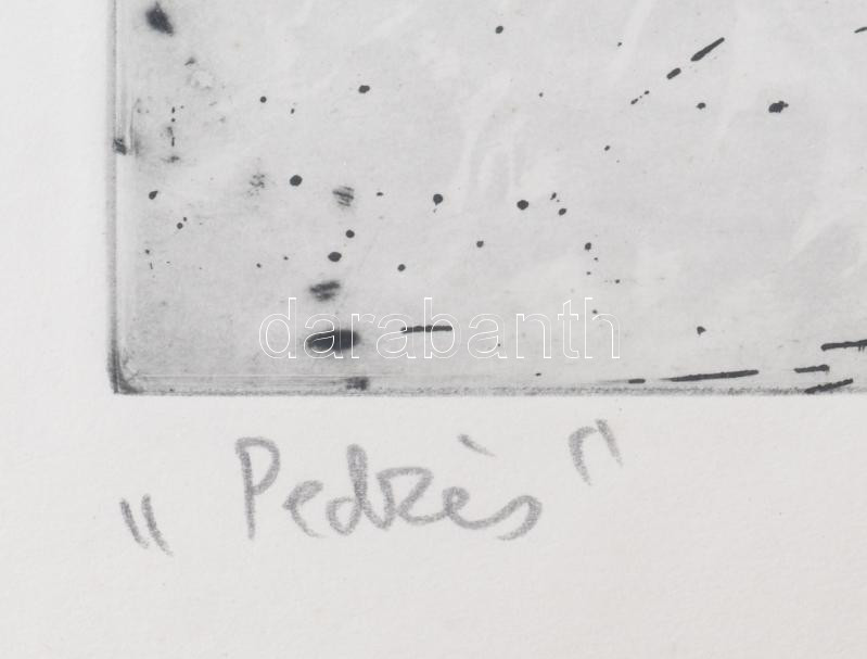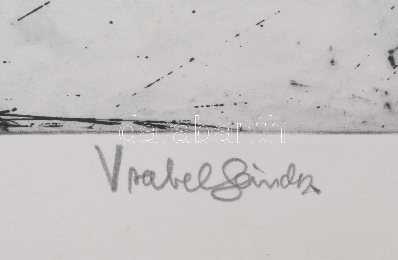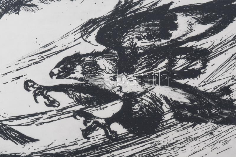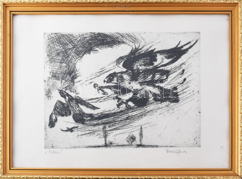 Leírás: Wrabel (Vrábel) Sándor (1926-1992): Pedzés (vadászat témájú grafika). Hidegtű, papír, jelzett, üvegezett fakeretben. 29x39 cm