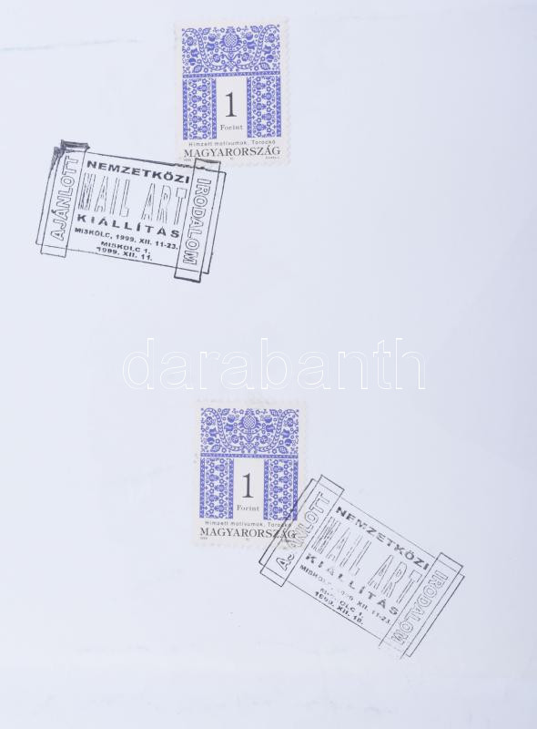 Leírás: 1999 Ajánlott irodalom/Registered Literature, Nemzetközi Küldeményművészeti Kiállítás/International Mail Art Exhibition, bélyegekkel és bélyegzésekkel kiegészített plakát, papír. Hajtásnyomokkal. 59,5×42 cm