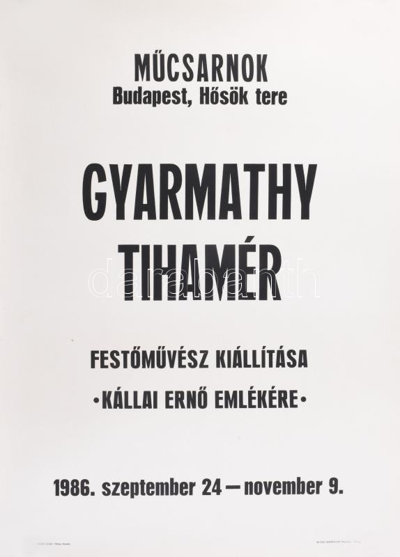 Leírás: Gyarmathy Tihamér kiállítása. 1986, Műcsarnok, Bp.. Kiállítási plakát, papír, Generalart Nyomda. Feltekerve. 70×50 cm.
