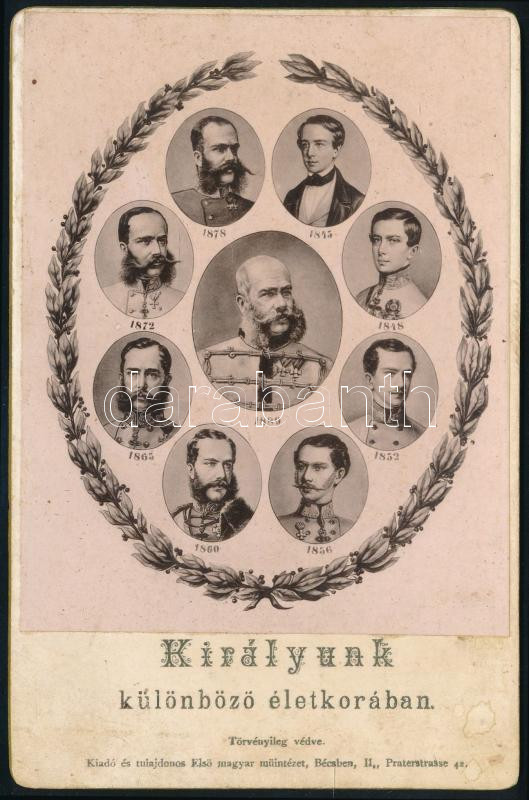 1899 Királyunk különböző életkorban. Ferencz József arcképeit bemutató... https://www.darabanth.com/hu/515-Filatelia-kepeslap-numizmatika-mutargy-konyv-papirregiseg-ekszer-aukcio/518.0/Fotomuveszet/Foto~1061/1899-Kiralyunk-kulonbozo-eletkorban-Ferencz-Jozsef-arckepeit-bemutato-kabinetfoto-11x17-c~II3486770