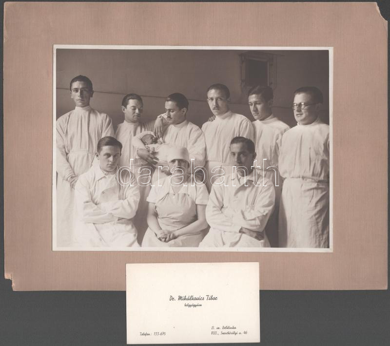 Leírás: cca 1930-1940 Orvosok csoportképe újszülött kisbabával, nagyméretű fotó kartonon, a kartonon kis sarokhiánnyal 17,5x23,5 cm, karton: 24x32,5 cm + Dr. Mihálkovics Tibor belgyógyász névjegykártyája