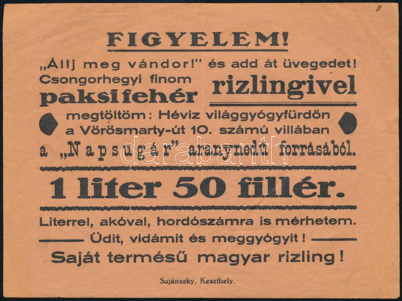 Leírás: cca 1925 Szórólap a Hévíz világgyógyfürdő Vörösmarty út 10. villájában történő csongorhegyi rizling árusításáról humoros formában, jó állapotban