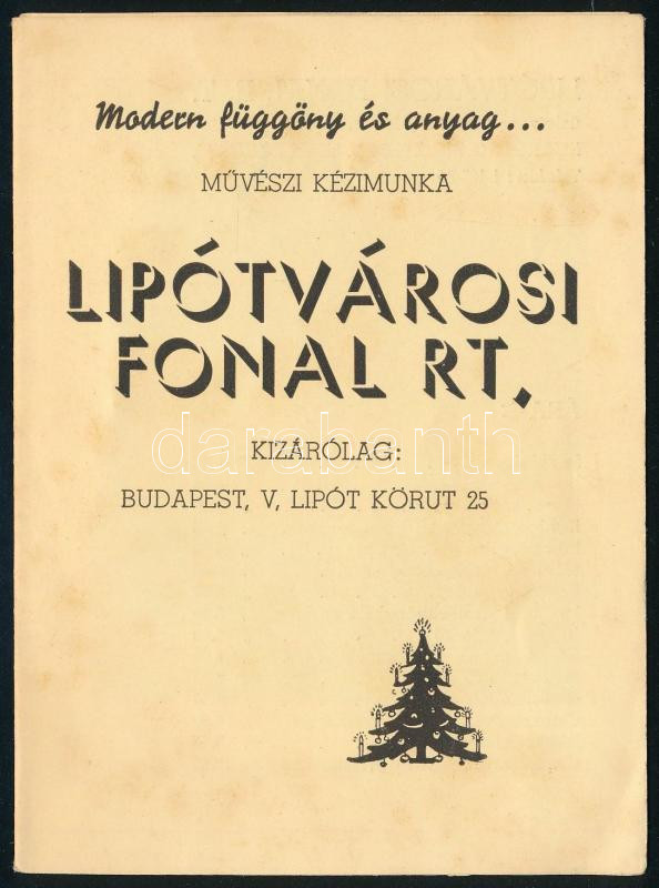 cca 1930 Lipótvárosi Fonal R.T. képes reklámprospektus, árjegyzék, kih... https://www.darabanth.com/hu/515-Filatelia-kepeslap-numizmatika-mutargy-konyv-papirregiseg-ekszer-aukcio/518.0/Fotomuveszet/Reklam~1062/cca-1930-Lipotvarosi-Fonal-RT-kepes-reklamprospektus-arjegyzek-kihajtva-12x35-cm~II3491866