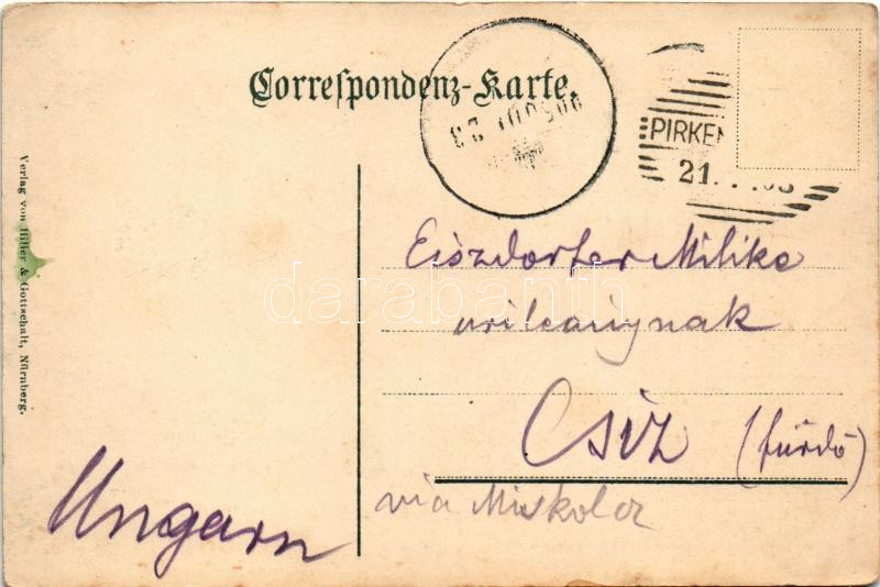 Leírás: 1905 Brezová, Pirkenhammer (Karlovy Vary, Karlsbad); Gruss aus dem Caférestaurant Schützenmühle in Pirkenhammer bei Karlsbad. Hiller & Gottschalt / café restaurant, lady with beer mugs. Art Nouveau, litho (EK)