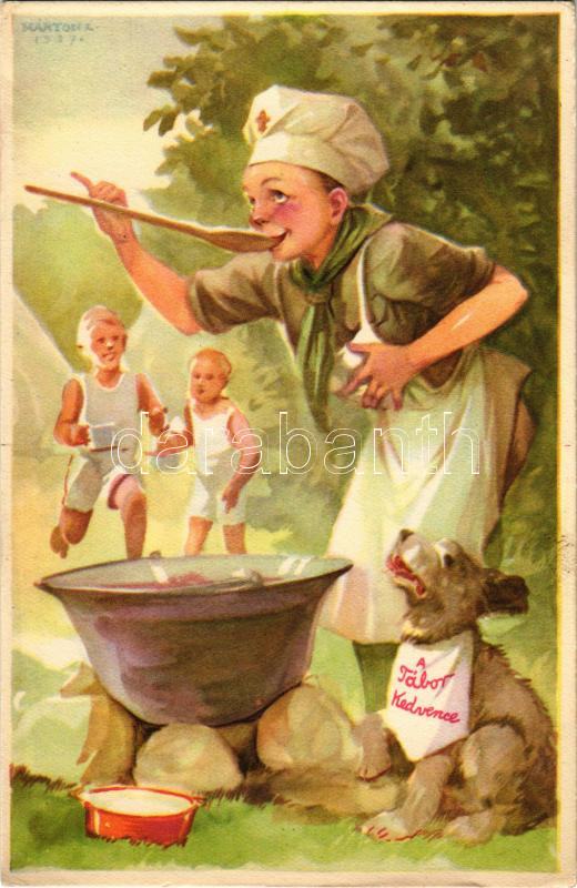 Leírás: A cserkész híven teljesíti kötelességét. Cserkész levelezőlapok kiadóhivatala / Hungarian boy scout art postcard s: Márton L. (EK)