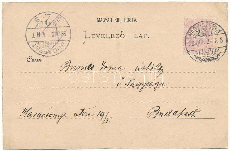 1898 Nagyszeben, Hermannstadt, Sibiu; Haus des Siebenbürgischen Vereins für Naturwissenschaften, Kleiner Ring mit Rathausturm / Városháza tornya, Erdélyi Természettudományi Társaság Háza, Természettudományi Múzeum, látkép. Szecessziós-virágos keret / town hall, house of the Transylvanian Society of Natural Sciences, Natural History Museum. Carl F. Jickeli Art Nouveau, floral (r)