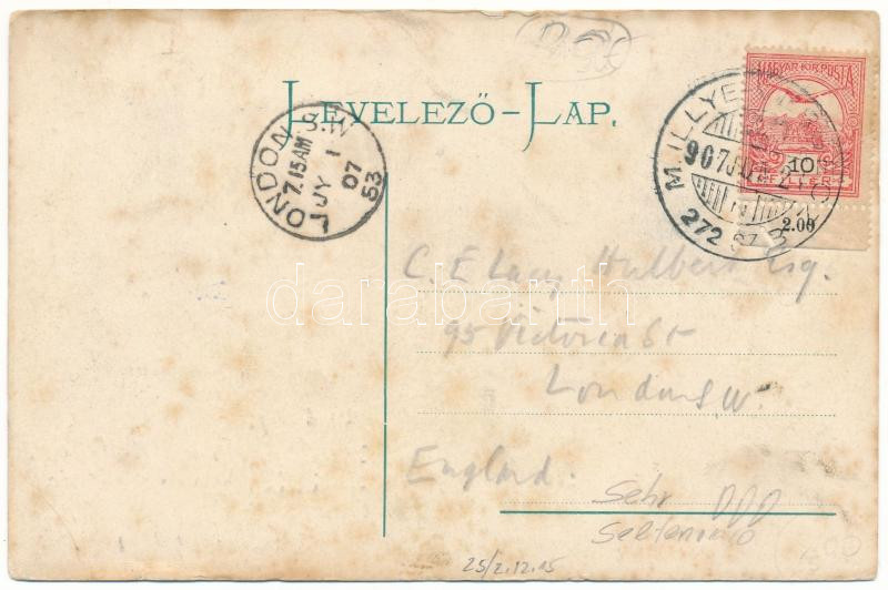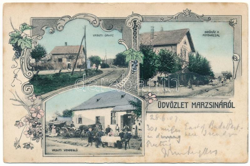 Leírás: 1907 Marzsina, Marschina, Margina; vasúti őrház, indóház a fűtőházzal, vasútállomás, vasúti vendéglő. Szecessziós-virágos keret / railway guardhouse, railway station, heating house, railway restaurant. Art Nouveau, floral frame + "M. ILLYE - VERSECZ 272. SZ. B" vasúti mozgóposta bélyegző (EB)