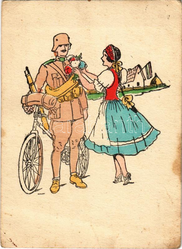 Leírás: Bevonulás, katonai kerékpárral. Kiadja a Délvidéki Egyetemi és Főiskolai Hallgatók Egyesülete / WWII Hungarian military art postcard, soldier with bicycle, entry of the Hungarian troops, folk costume, irredenta propaganda (fl)
