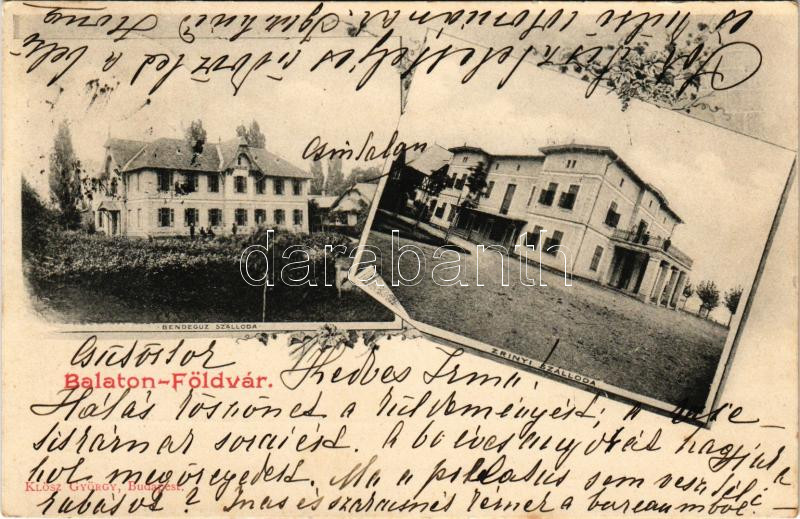 Leírás: 1902 Balatonföldvár, Bendegúz szálloda, Zrínyi szálloda. Klösz György kiadása. Art Nouveau, floral (fl)