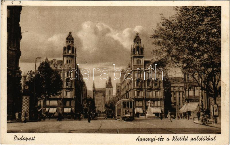 1940 Budapest V. Apponyi tér a Klotild palotákkal, villamos, Kőszegi ü... https://www.darabanth.com/hu/515-Filatelia-kepeslap-numizmatika-mutargy-konyv-papirregiseg-ekszer-aukcio/518.0/Kepeslapok/Magyarorszag~888/1940-Budapest-V-Apponyi-ter-a-Klotild-palotakkal-villamos-Koszegi-uzlete-Erzsebet-hid~II3483973