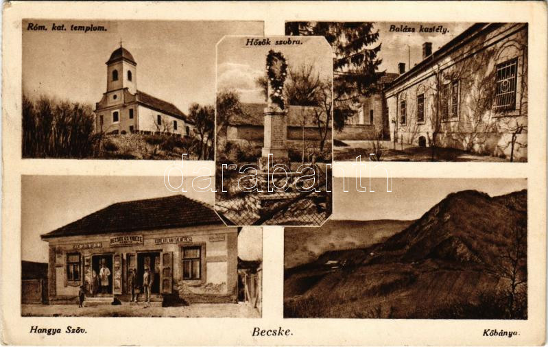 Leírás: Becske, Hősök szobra, Római katolikus templom, Balázs kastély, Hősök szobra, kőbánya. Hangya szövetkezet üzlete és saját kiadása (EK)