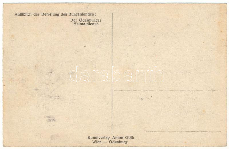 Burgenländer, Odenburger, wehrt Euch gegen die wirtschaftliche Abschnürung. Sie ist Euer Untergang! Anläßlich der Befreiung des Burgenlandes: Der Ödenburger Heimatdienst. Kunstverlag Amon Göth / Burgenland felszabadítása alkalmából: a soproni hazaszolgálat, magyarellenes propaganda / On the occasion of the liberation of Burgenland: the Ödenburg homeland service, propaganda against Hungary (EK)