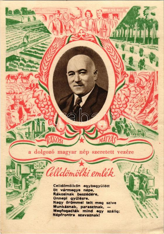 Rákosi Mátyás, a dolgozó magyar nép szeretett vezére. Celldömölki emlék. Szikra nyomda / Mátyás Rákosi communist propaganda card (gyűrődések / creases)