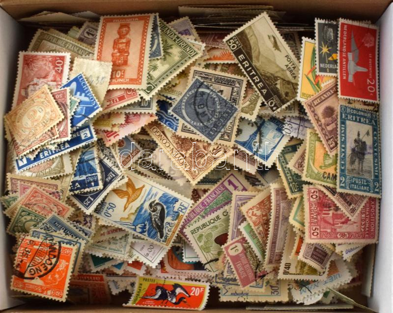Leírás: Gyarmati és utódállamok: több ezer darab bélyeg dobozban ömlesztve