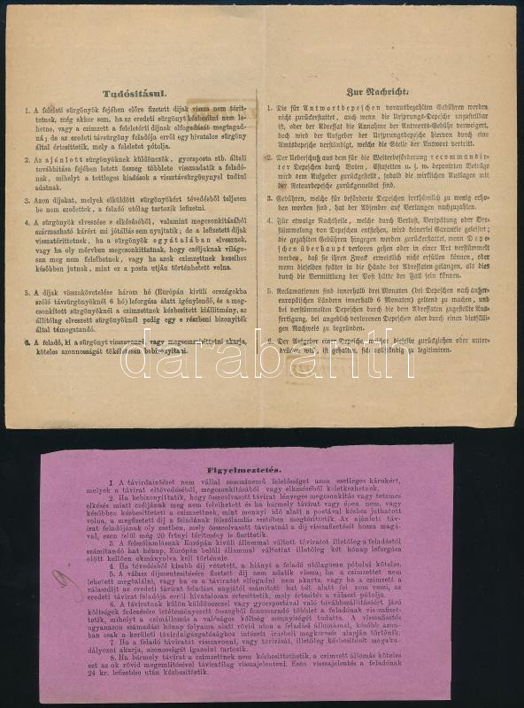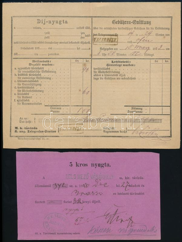 Leírás: 1873/1880 2 db távirati díjnyugta "VÁSÁRHELY"