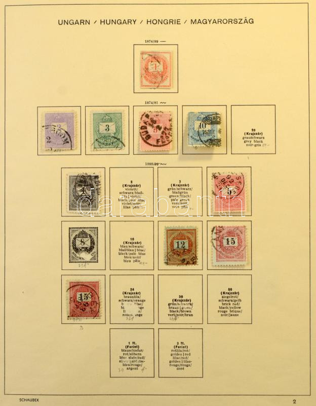1874-1948 Magyar bélyegek, köztük hivatalosak és portók is, 70 db Scha... https://www.darabanth.com/hu/515-Filatelia-kepeslap-numizmatika-mutargy-konyv-papirregiseg-ekszer-aukcio/518.0/Kiemelt-magyar-filatelia-tetelek-es-gyujtemenyek/Magyar-gyujtemenyek-es-tetelek~69/1874-1948-Magyar-belyegek-koztuk-hivatalosak-es-portok-is-70-db-Schaubek-elonyomott-albumlap~II3491068