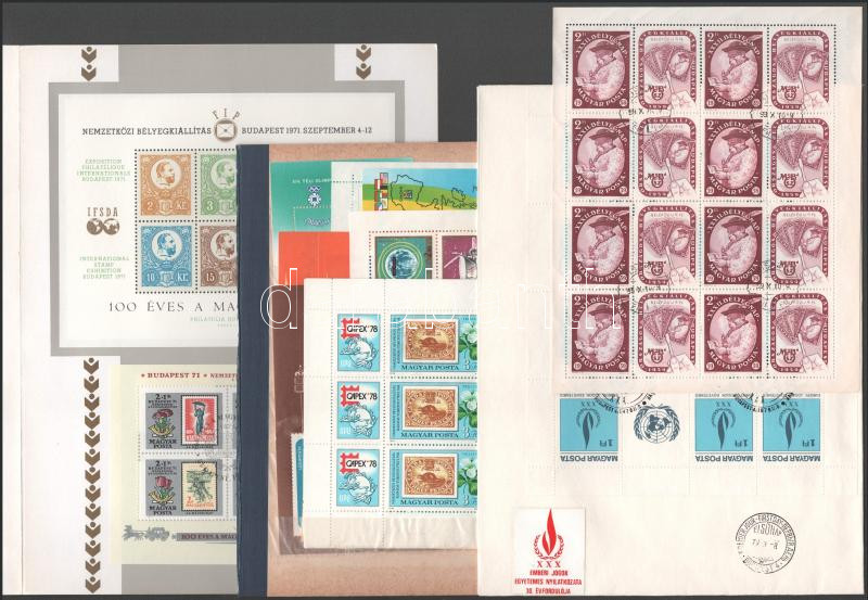 Leírás: Kis tétel az 1959-2012 közötti időszakból, benne blokkok, kisívek, összesen 18 db, közte Bélyegnap, Emberi jogok, Bélyegkiállítás, Cserkész, Festmény, Magyarország állatvilága, II. János Pál