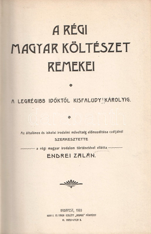 A régi magyar költészet remekei. A legrégibb időktől Kisfaludy Károlyig. Az általános és iskolai irodalmi műveltség előmozdítása czéljából szerkesztette és a régi magyar irodalom történetével ellátta Endrei Zalán.