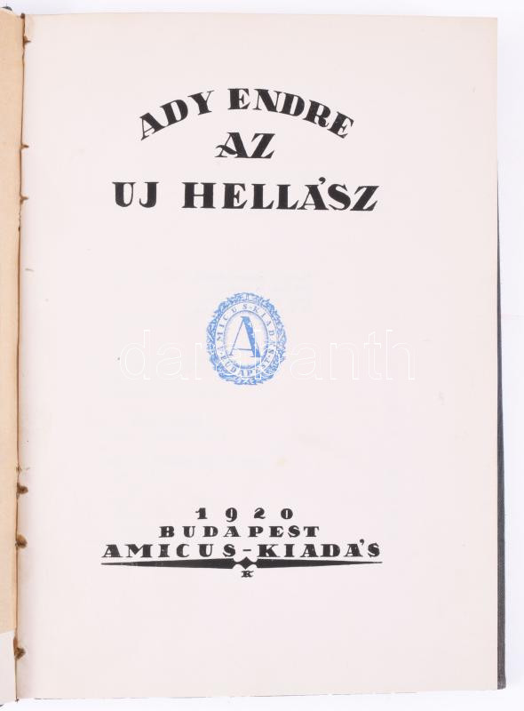 Ady Endre: Az új Hellász. [Karcolatok.] (Számozott.) Budapest, 1920. Amicus-kiadás (Hornyánszky Viktor ny.) 110 p. Egyetlen kiadás. A számozott, bibliofil kötet kolofonja: ,,Ady Endre jelen kiadásban megjelent műveit az Amicus kiadóvállalat megbízásából 1920 szeptemberében Hornyánszky Viktor királyi udvari könyvnyomdája nyomtatta. A címlapot, kötést és a kezdőbetűket Kozma Lajos tervezte. Készült 1400 számozott példány, legfinomabb antiqua papiroson. Az első huszonöt példány bőrkötést kapott. 1255. szám". Ady Endre korai publicisztikáit Kozma Lajos fametszetei kísérik. A szenvedélyes hangon megírt, elfogulatlanságra nemigen törekvő karcolatok 1901-1907 között keletkeztek.
