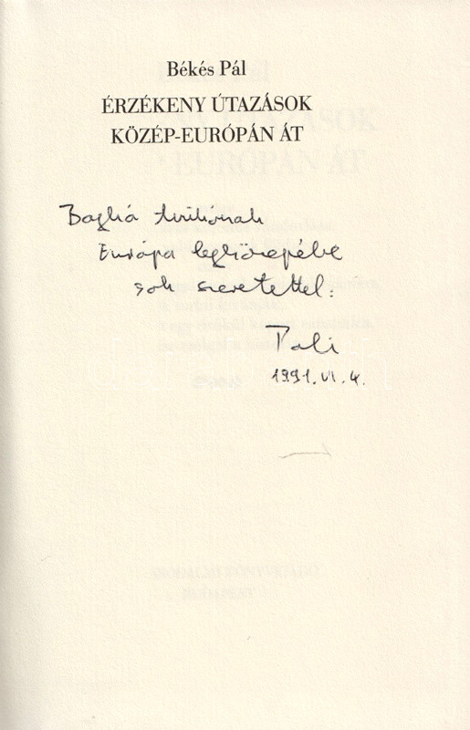 Dedikált: "Bajkó Anikónak Európa legközepébe sok szeretettel: Pali. 1991. VI. 4".