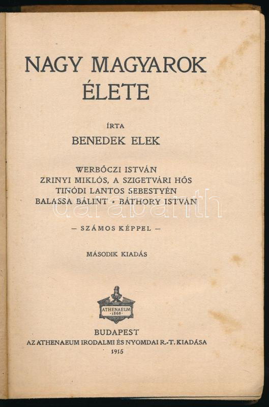 Benedek Elek: Nagy magyarok élete. WerbÅ‘czi István, ZrÃnyi Miklós, a szigetvári hÅ‘s, Tinódi Lantos Sebestyén, Balassa Bálint, Báthory István. Bp., 1918., Athenaeum. Kiadói illusztrált félvászon-kötés, kopott, foltos borÃtóval, a hátsó borÃtóm firkával.