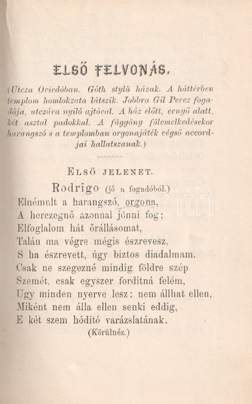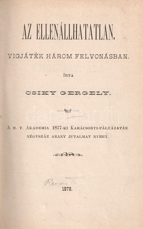 Csiky Gergely (1842-1891), az irodalom iránt mindig is élénken érdeklődő Csanád egyházmegyei papneveldei tanár az 1870-es években egyházjogot és történelmet oktatott, ám első, pályázatra írt drámájával már 1875-ben díjat nyert. A következő években egymás után írta változatos témájú színműveit, "Az ellenállhatatlan" című, spanyol udvarban játszódó verses vígjátékával újabb díjat szerzett. A mű első, 1877. évi kiadása még a nyomda feltüntetése nélkül jelent meg, ám 1878-as kiadásból származó példányunk impresszuma viszont már feltünteti egyházmegyei nyomdáját. Az egyre inkább a frivol irodalom felé forduló Csiky Gergelyt püspöke a következő években eltanácsolta a papi állástól, a szerző kilépett a papi rendből, és egy párizsi utat követően a magyar színpadok kiemelkedő szerzőjévé lett. Korai vígjátékában még a Rákosi Jenő-féle, realista célokat ki nem tűző újromantikus színmű hatása alatt áll, ez azonban papi rendből való kilépése után, francia útját követően megváltozott.