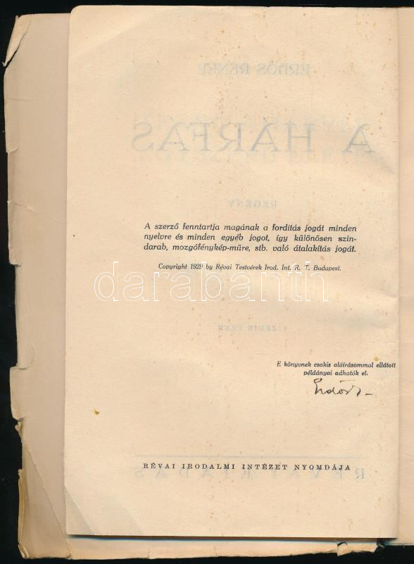 Leírás: Erdős Renée: A hárfás. Teano Amaryll egyszerű élete első könyv. ALÁÍRT! Bp., 1929, Révai. Kiadói papírkötés, viseltes állapotban.