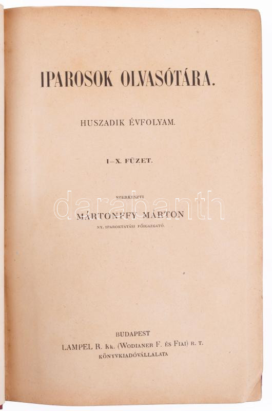 Iparosok olvasótára XX. évf. I-X. füzet. Szerk.: Mártonfy Márton. Bp.,... https://www.darabanth.com/hu/515-Filatelia-kepeslap-numizmatika-mutargy-konyv-papirregiseg-ekszer-aukcio/518.0/Konyvek/Konyvek-Egyeb-ritkasagok~1056/Iparosok-olvasotara-XX-evf-I-X-fuzet-Szerk-Martonfy-Marton-Bp-1914-Lampel-R-Wodia~II3492419