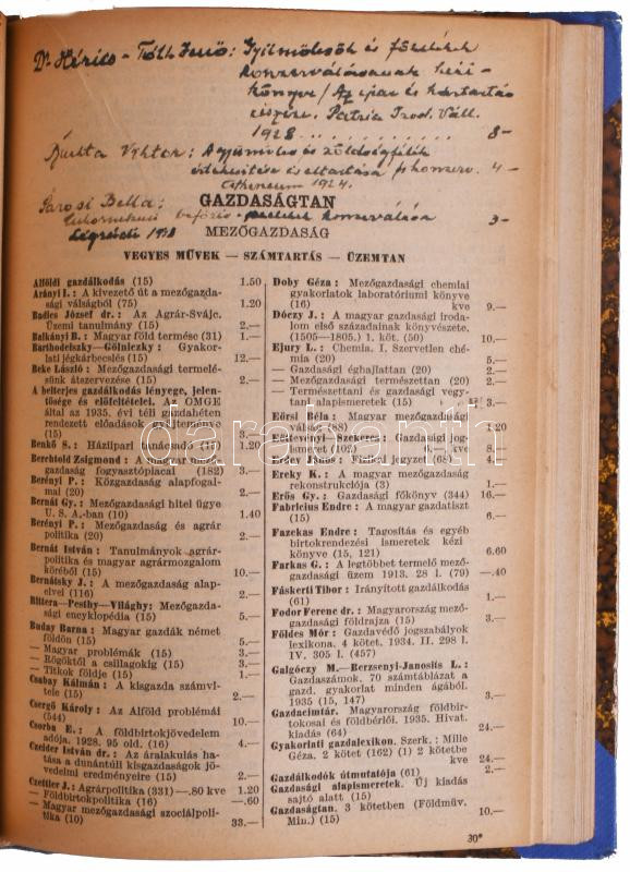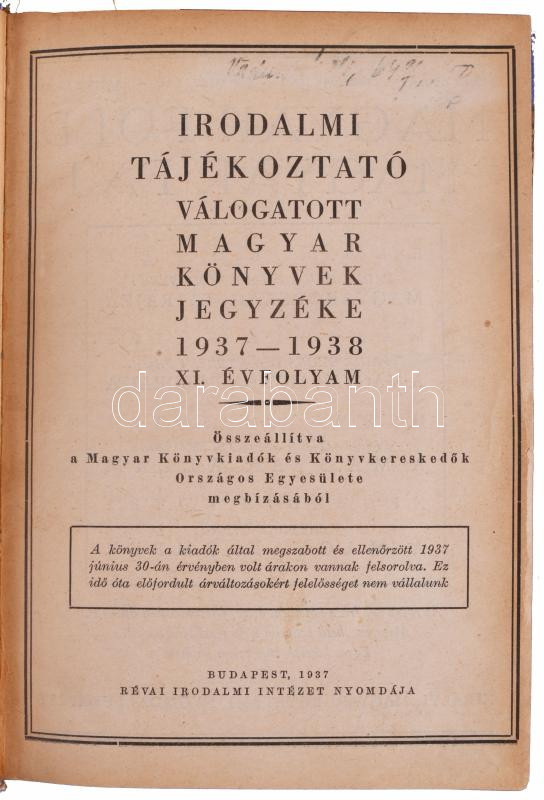Irodalmi tájékoztató. Válogatott magyar könyvek jegyzéke 1937-1938. XI. évf. Összeáll. Magyar Könyvkiadók és Könyvkereskedők Országos Egyesülete megbízásából. Bp., 1937., Révai, 1084 (duplahasábos számozás) p. Hozzákötve: Revizori könyvjegyzék. Bp., én., Politzer Zsigmond és Fia, (Radó István-ny.), 16 p. Hozzákötve: A Biztosító Magánvállalatok M. Kir. Állami Felügyelő Hatósága Könyvtárának könyvjegyzéke. Bp., 1930.,(Kondor I-ny.), 77+3 p. Átkötött félvászon-kötés, kopott borítóval.