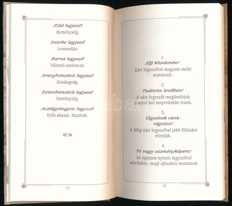 Leírás: Legujabb és legteljesebb legyező-, bélyeg-, keztyű, zsebkendő- és szinnyelv. Bp., 2000, Pallas Stúdió. Kiadói kartonált papírkötés.