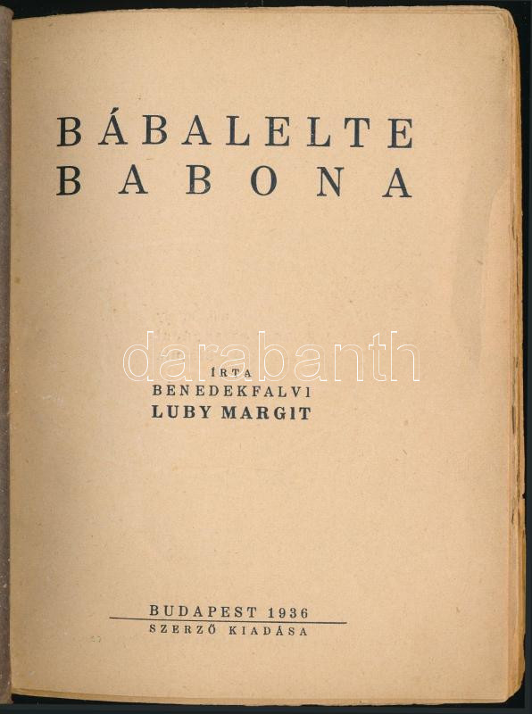 Luby Margit: Bábalelte babona. Bp., 1936 ,Szerzői. Első kiadás. 95p. k... https://www.darabanth.com/hu/515-Filatelia-kepeslap-numizmatika-mutargy-konyv-papirregiseg-ekszer-aukcio/518.0/Konyvek/Konyvek-Egyeb-ritkasagok~1056/Luby-Margit-Babalelte-babona-Bp-1936-Szerzoi-Elso-kiadas-95p-kiadoi-papirboritoval-~II3468101