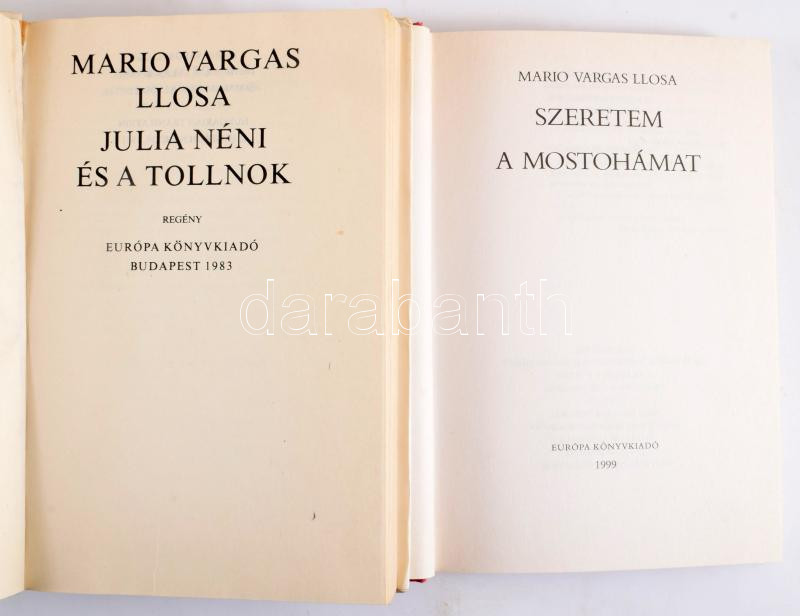 Leírás: Mario Vargas Llosa: Júlia néni és a tollnok. Szeretem a mostohámat. Bp., 1983-1999., Európa. Kiadói egészvászon-kötés, kiadói kartonált papírkötés, kiadói papír védőborítóban.